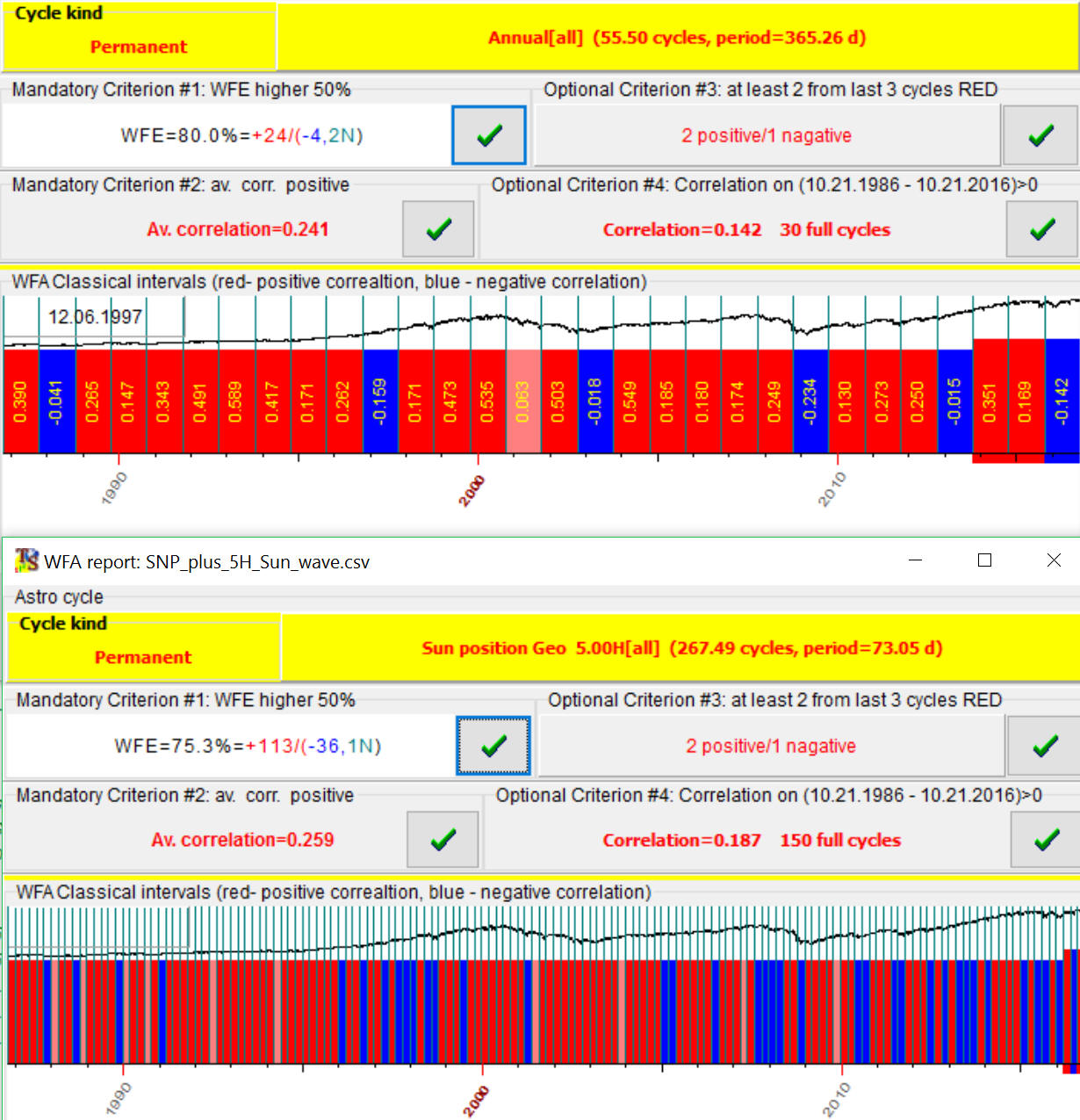 Regarding harmonics, this is the same story. We are tossing the one and the same cycle. I've prepared a special example to explain how it works. I have downloaded SNP500 since 1960 and have added  5H Sun cycle to this data. In other words, in this data 73.053 days cycle is definitely present. Let's conduct walk forward analysis for 5H Sun cycle; it shows that - Yes, this cycle works. But let's conduct walk forward analysis (WFA) for the whole Sun cycle; and WFA shows that this cycle works as well. Here are results of both WFAs: