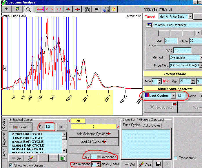 Below is an image of the selection screen I used. For my approx. 12 weeks of data it assigned a preliminary forecast to each planetary cycle I selected. I then entered a processing screen (not shown) where all the planets forecasts were summed together. Here I was able to optimize this summed forecast on the most current 3 weeks of my RPO.