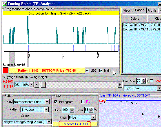 Instead of using an RPO I'm applying a .3% zig-zag indicator. As you can see by looking at the parameters I'm looking to find price levels that correspond to retracement levels (a bottom). Some of these parameters are a bit complex to describe in this brief - more info is available in an article devoted to this module on the TS web-site (www.TimingSolution.com). The process applied is similar to the method know as Symmetry popularized by Robert Krausz in the 1990's, where the size of prior price swings are used to predict the end of the current price swing. The diagram window (in the below image) shows the areas of support this module found.