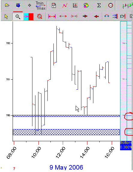 These areas of support are transferred to the main screen - see the blue margin on the right of the price chart - the areas I circled are where two or more support levels clustered together. As it worked out these were the actual levels where price found support that day. By using the forecasts I could anticipate price rising from the lowest area around 10:30. I could anticipate the forecasted downswing ending at one of those two zones - by 14:45 (2:45pm) you'd know it was the higher zone.
