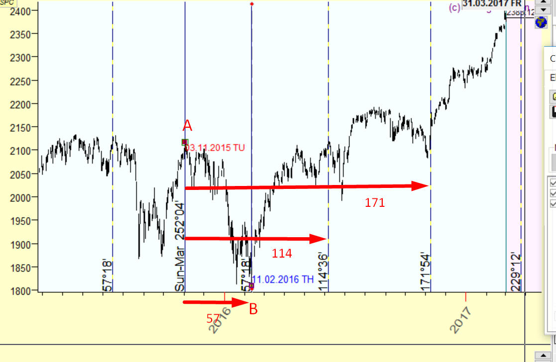 We analyze two turning points: TOP November 3, 2015 and BOTTOM February 11, 2016. We calculate how the angle separation between two planets, Earth and Mars in helio, changes. Within this period (about three months) this angle has increased on 57 degrees. Now we prolong this 57 degrees interval into the future. You see as 114 degrees increment takes place at the beginning of June 2016 (local TOP). A new step, 171 degrees, is at the beginning of November 2016 (BOTTOM). Etc., we can prolong these lines into the future (and into the past) for as long as we need.