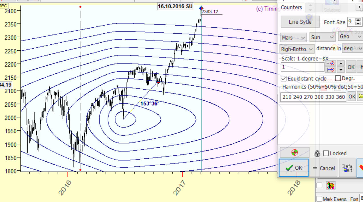 These cycles with the center at BOTTOM June 27, 2016 represent 30, 60, 90, 120 ... 360 degrees cycles. As a scaling angle, we use the angle separation between the San and Mars geo. Also we use price/time ratio $1 of price movement equal to 1 degree of Sun-Mars geo increment. Thus we can calculate a distance between two price/time points on our price chart and accordingly calculate equidistant cycles.
