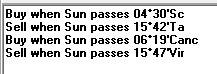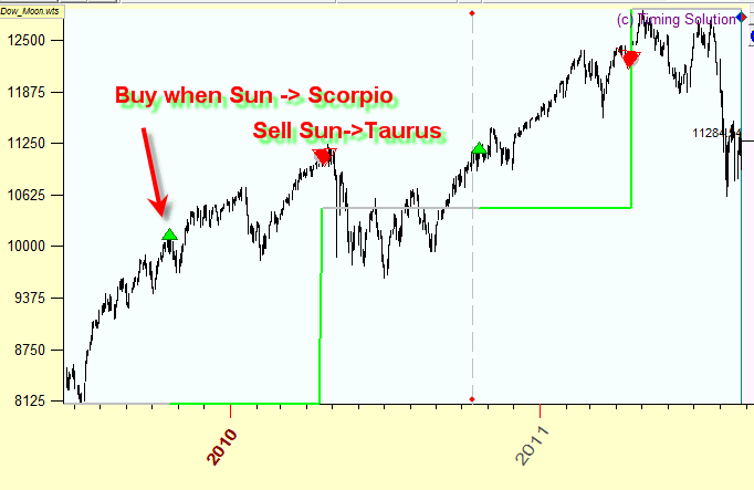 Example #1: once a year we buy the shares of some company X when the Sun ingresses Scorpio and sell them when the Sun ingresses Taurus. We expect that within this six month period (October 21- May 19) the price for these shares of the company X will rise; here money is made by taking a long trade. Do not forget, this is just an example; I want to show that it is possible to trade using astro phenomena as trading signals. This is how such a trading strategy looks: