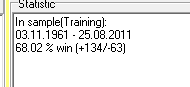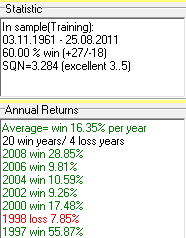 A little bit of statistics: if this system would be used for trading since 1961 till 2011, it could make 200 trades (four trades per year), and 68% trades were winning: