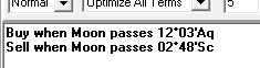 Moon-Sun 180and the program immediately has calculated these signals,. And you can see right away the signals, the corresponding equity curve as well as some statistical information: