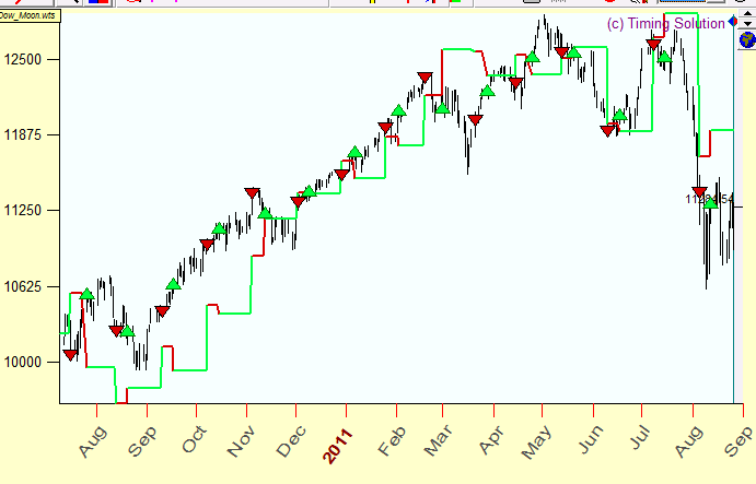 Buy when the Moon passes 12th degree of Aquarius and sell when the Moon passes 2nd degree of Scorpio. The angle separation between these signals is big enough. This system provides 56% winning trades (223 win versus 174 loss). This is how this model would work for the last year: