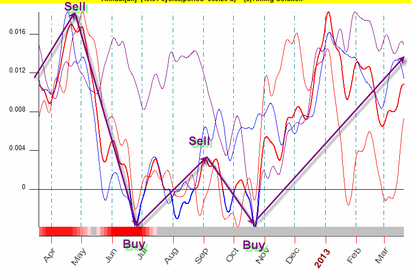 As you see this strategy based on the Annual cycle recommends six trades within a year: the beginning of March - buy, the end of April - sell, the end of June - buy, the beginning of September - sell, mid of October - buy and sell just before the New Year. This is full Annual trading cycle. I was almost ready to announce this trading strategy as a basic one when the more detailed analysis revealed some unexpected results.