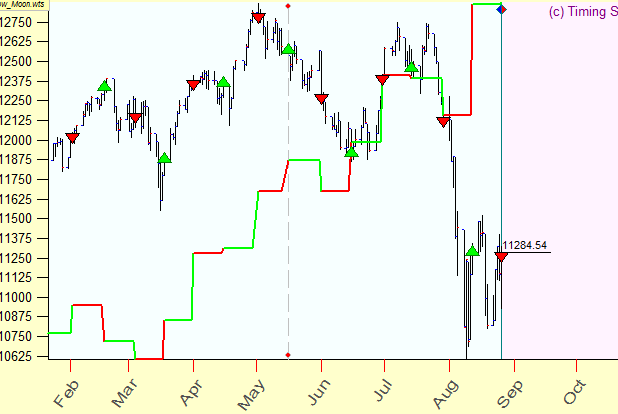 As you see, this system generates Buy signal when the Moon passes 4th degree of Taurus and Sell signal when the Moon passes 21st degree of Pisces. In other words, buy and sell signals are located very close, 2-3 days difference. Close located signals mean that this system does not work, this is practically a "buy-and-hold" system. It also means that within 50 years interval we cannot specify some stable Moon pattern, within 50 years this pattern has being changed. So now try to download less price history and perform the Moon cycle optimization once again. Download 40 years of price history, optimize signals and watch them. If these signals are close (i.e. the system does not work), download 30 years of price history and check this system again. I Have found that the system works when the last 15 years of price history are downloaded. Here is: