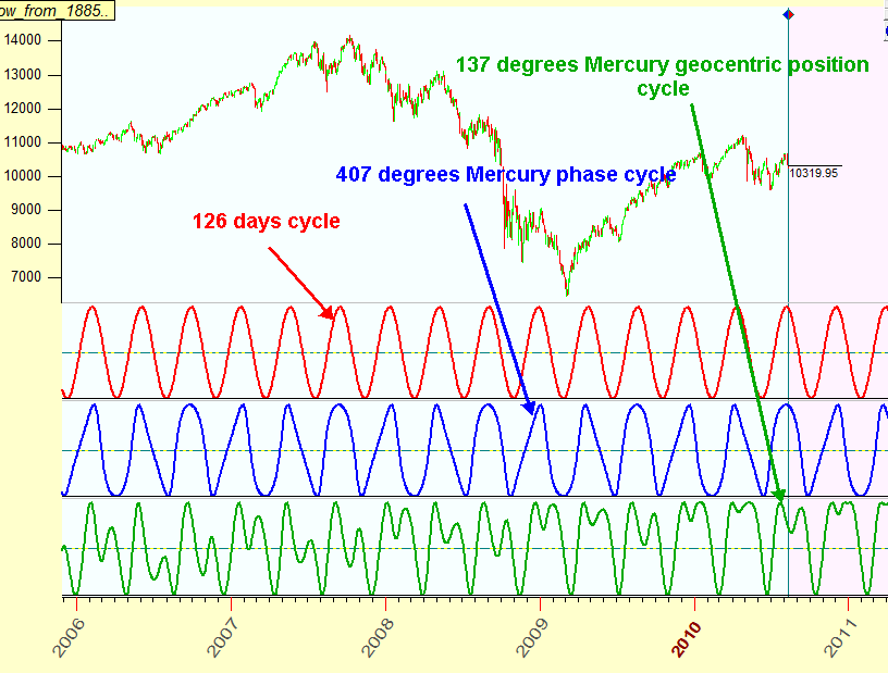 Why this is important? Look now at the prolonged cycles: 126-days cycle (black stripes), 407 degrees Mercury phase cycle (red) and 137 degrees Mercury geocentric position cycles (blue).