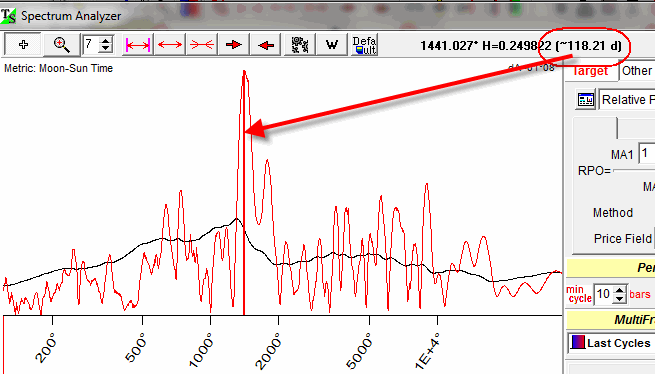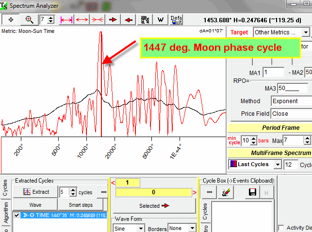 In our example 1447 Moon phase degree cycle approximately corresponds to 118-days cycle (approximately because this is an irregular cycle):
