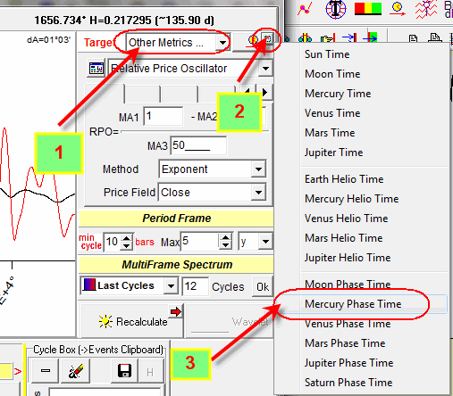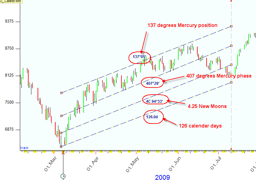 In other words the price tends repeat its pattern every time when Mercury travels 123 degrees. We can drag and drop this cycle to the Main screen and calculate the projection line based on this dominant cycle.