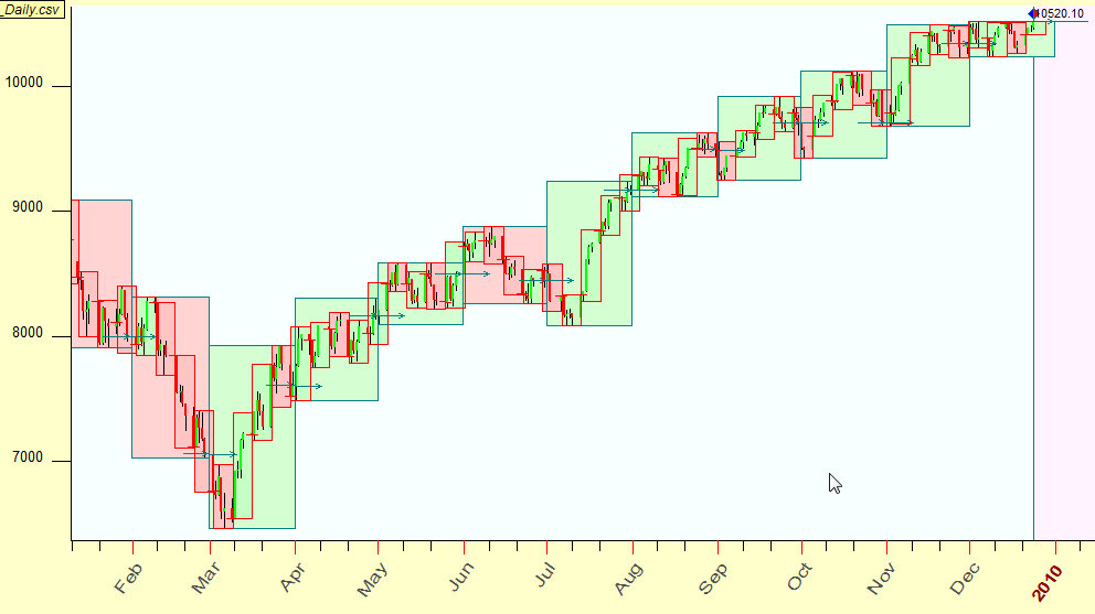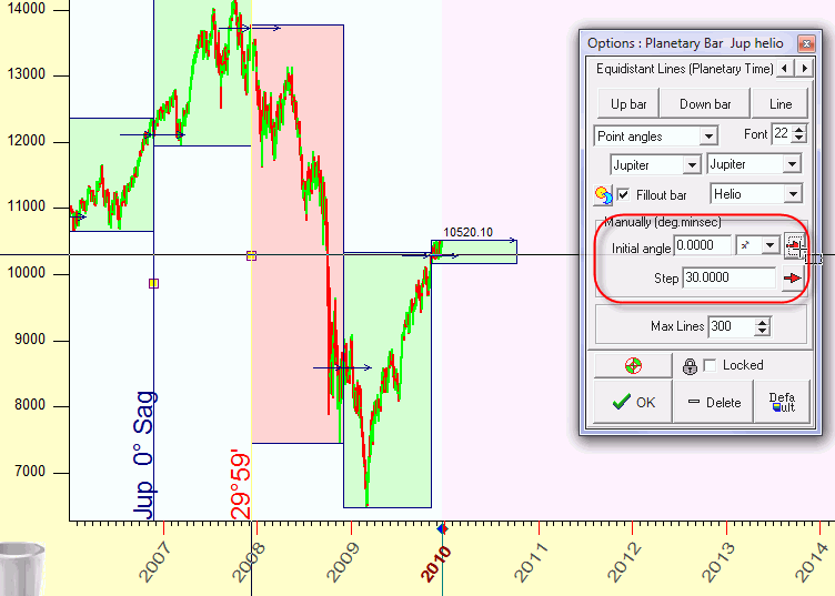 This technique is pretty obvious. Just look at this example. Suppose we have created Jupiter in Zodiac signs price bar chart. We have used these settings: