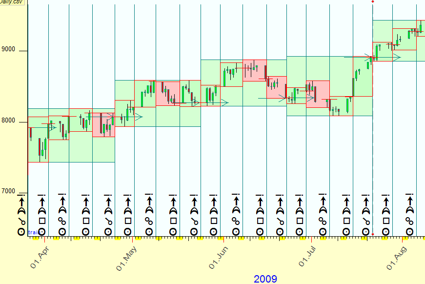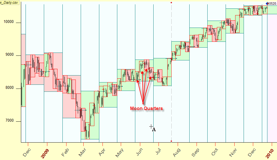 In other words, the program calculates how the price changes between two New Moons; we can see the highest and the lowest price within this Moon cycle and also the price at the beginning and the end of this cycle.