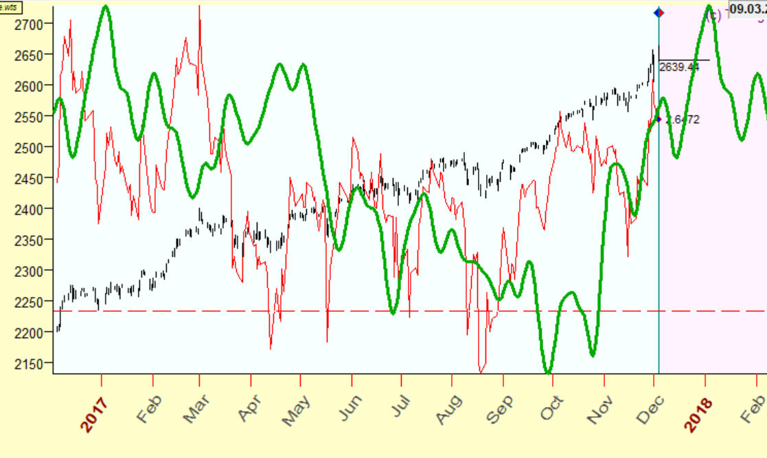 Today is December 4, 2017. Let's go for one year back, to December 4, 2016. At that day you make a bet with your friends that you can create a forecast for SNP500 based on Annual cycle. So, on Sunday, December 4, 2016, you calculated a projection line based on Annual cycle that goes to the next year - up to December 4, 2017. You put this projection line in some safe place, and today, on December 4, 2017, your friend takes this projection line from that safe place and draws this projection line overlaying the SNP500 chart, same as you can see here (the green line is Annual cycle, the red one - RPO(1,73,73), and the black is SNP500 price chart):