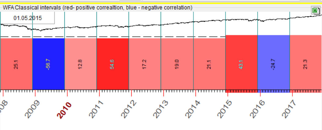 To get more precise picture regarding the performance of this model, we should have similar bets in 2015 (a forecast since December 2015 till December 2016), 2014, 2013, 2112 etc. years. Let say we have them. Combining them all together, we get a result of application of Walk Forward Analysis for Annual cycle. Red bars show the periods when the forecast based on Annual cycle was good, blue - not good: