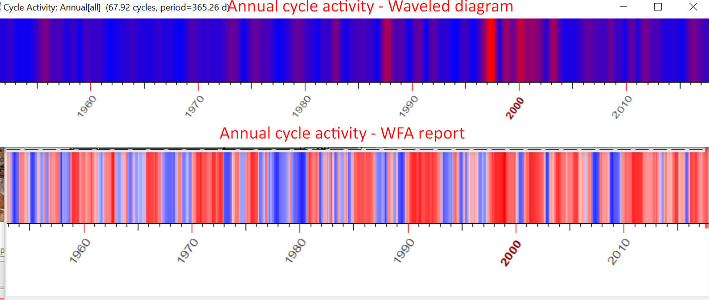 As you see, the Annual cycle activity calculated in classical style (i.e. wavelet diagram) and calculated using Walk Forward Analysis gives totally different results. Here are both these diagrams: