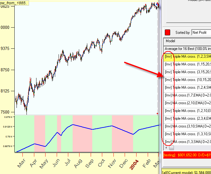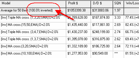 This module searches the most tradable strategies for any financial instrument. Of course it allows to find the optimal moving averages crossover for that instrument. In our example for DJI, it examines more than one thousand strategies based on different moving averages and shows the statistic information for the first 50 most profitable ones. Here it is: