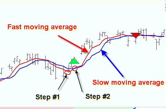 Step #2 - wait some time while this up trend movement is confirmed by up movement; the crossover with the slow moving average employs this procedure