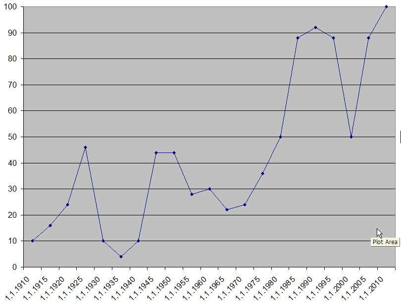 Let's look how this index has changed in time. I have downloaded the DJI price history data since the year 1890 and examined moving strategies on different 10 years intervals: 1890-1900, 1895-1905, 1900-1910 etc. For each interval, the Inversion Index is calculated. Here it is: