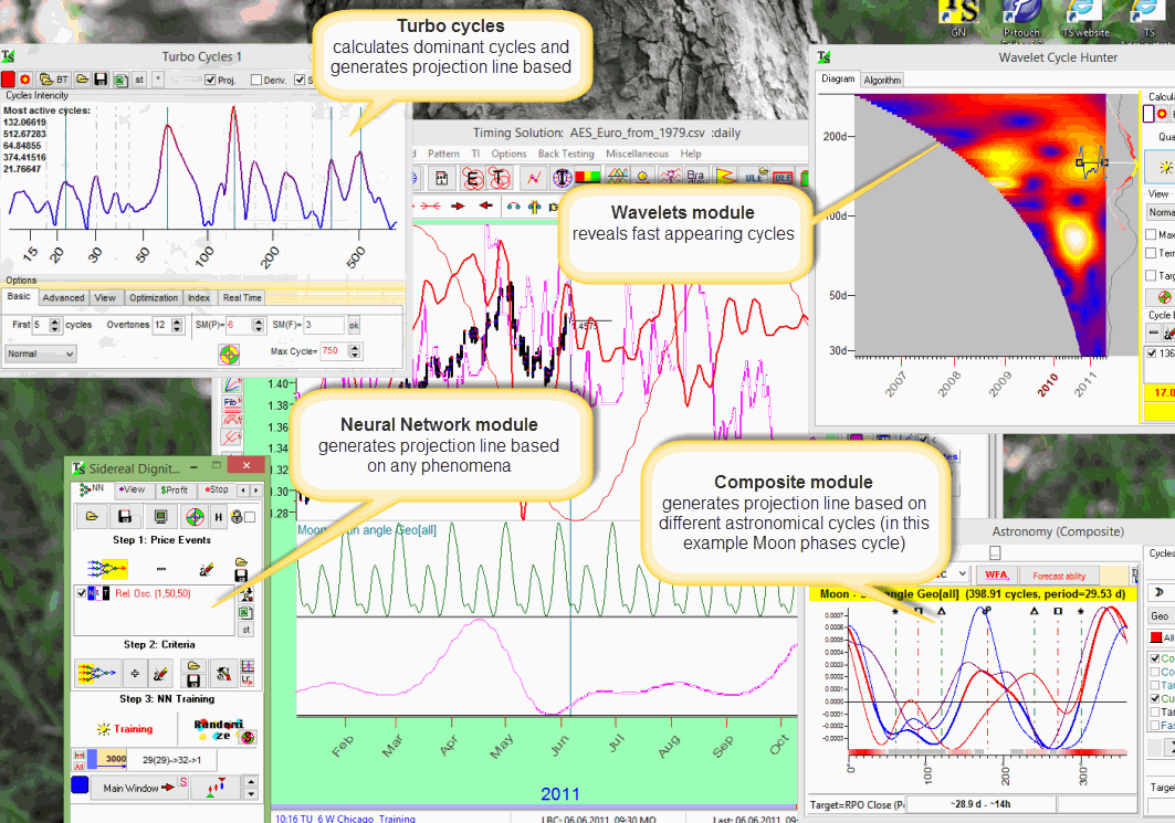 Here four modules are run at the same time. Each of these modules has many parameters to vary; it is necessary to increase a forecasting ability of projection lines generated by these modules. All these modules are very complicated, practically each of them works as a stand alone program that analyzes the stock market from a different point of view.