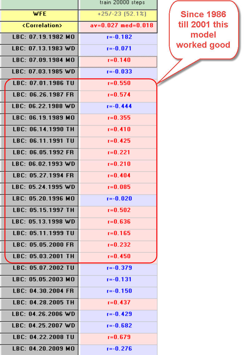 As you see, since 1986 till 2001 this model worked well and after that it stopped working. We don't quite understand the nature of this phenomenon. Maybe this model really works this way: sometimes it works, sometimes not.