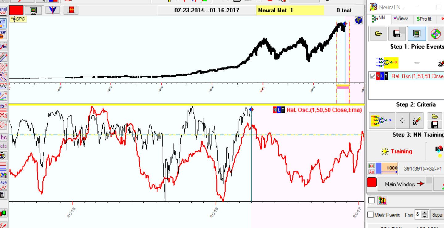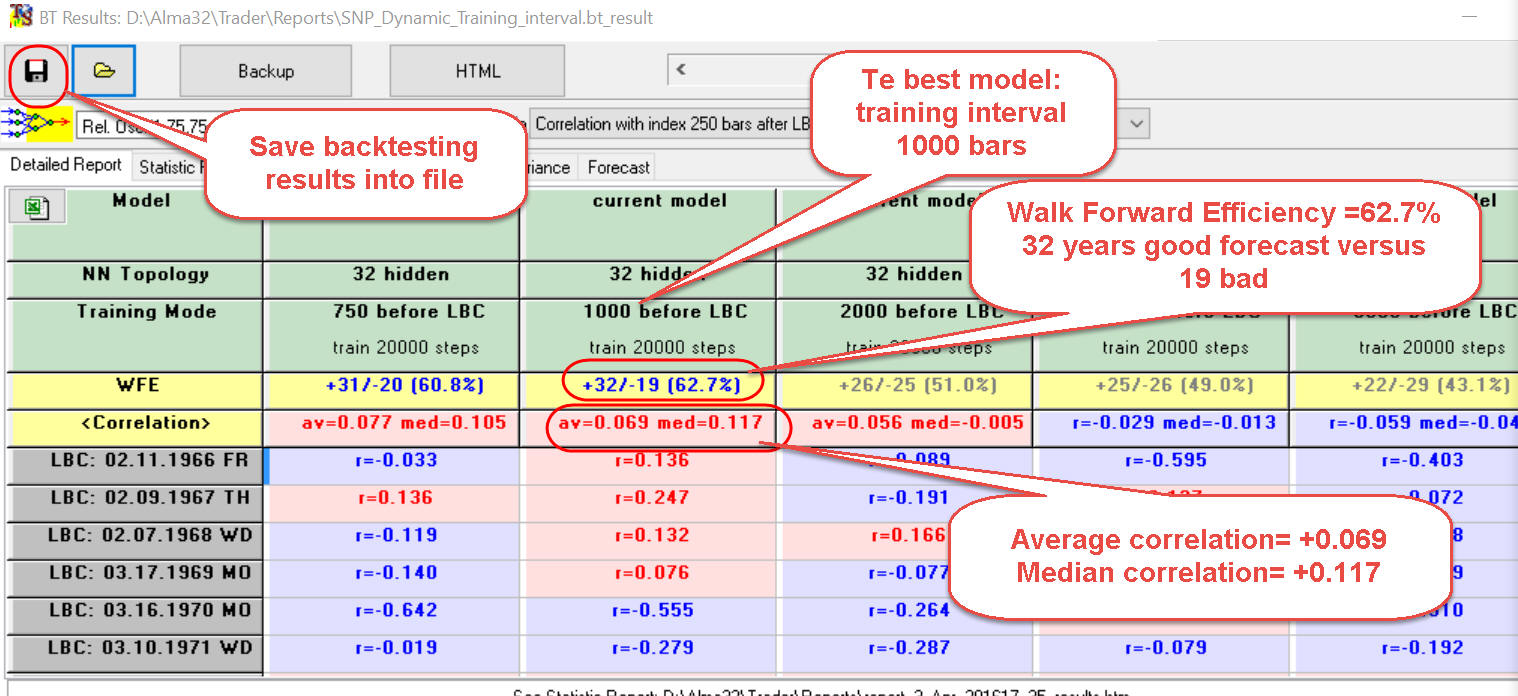 Another scenario allows to optimize a training interval for your NN. For example, we would like to know how many years of price history we should have to get the best projection line: 750 bars (3 years for EOD), 1000 bars (4 years), 2000 bars (8 years) etc.? This scenario helps to answer this question.