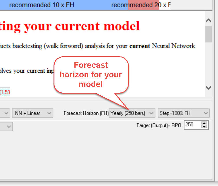 2) Forecast Horizon (FH) You have to specify the forecast horizon for your model. For example, if the model is based on Annual cycle, its forecast horizon is 365 days (or 250 trading days for EOD data). A forecast horizon of Moon phases model is 29.5 years (or 20 trading days, but better use 25 trading days due to statistical reasons).