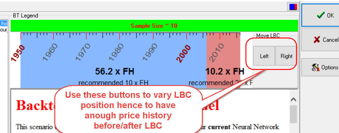 Now you should divide the whole downloaded price history in two intervals: blue - training, red - testing. LBC - the border between these intervals. Use these buttons to shift LBC position: