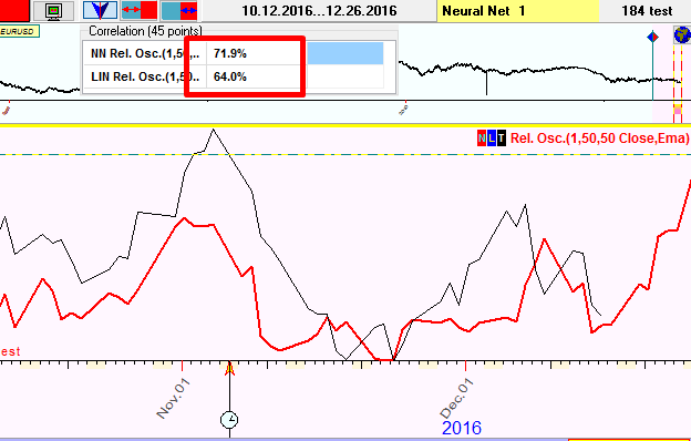 Here I would like to answer some questions asked by a user. He analyzed Neural Net projection line and got a very big correlation between the price and the projection line. Look, here the correlation reaches 71.9%: