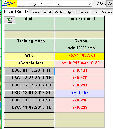To get more reliable picture, I would recommend to conduct Walk Forward Analysis for this model. De facto it conducts the procedure explained above several times, this amount we call a sample size (SZ). The interval of two years that we used to calculate the correlation is called Forecast Horizon (FH). It should be long enough to provide a variety of data. Typically as Forecast Horizon we can use the period of the most typical cycles. For Annual cycle it would be one year, for Moon cycle - one month. In this example we can apply one year FH as well, within this interval this model still provides enough variety of data.