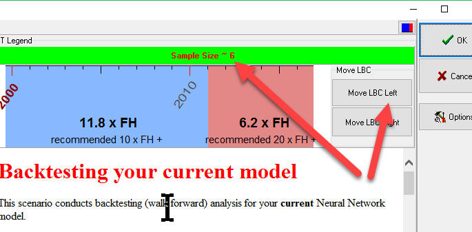 Click several times "Move LBC Left" button to move LBC to the left to have more price history for testing/out of sample interval. This way we increase Sample Size (SZ). Let it be 6:
