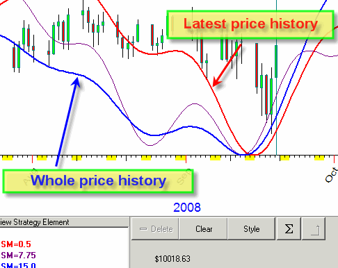 It indicates how many price history is used to get a forecast. In this example the stock memory varies between 0.5 and 15. So the first red projection line of this committee is based on 0.5 cycles of history, it takes into account the last cycle only. While the last blue projection line is based on 15 cycles of price history, so it looks deeper into market's history. The first model is concentrated on the most recent price movements only, while the second projection line tries to deal with the whole picture: