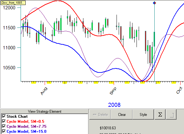 Let us start with Annual cycle. I am able to download the price history for Dow from the year 1885 till now (2008). It is 123 years of price history. And we need to calculate the Annual cycle. But - there is a question: how much history is it better to use for the calculation of the Annual cycle? We may use all 123 years of price history. However, there is some opinion: we need to use only the last 5-6 years as the stock market in 1970s and the stock market now are totally different entities. Another opinion is to use 20 years of price history (20 years form so called Kuznets' cycle used by some economists). We can spend a lot of time discussing these and other options, and the truth will continue to be out there. Timing Solution users are in better position here; they do not need to choose one option or another. They may run Committee feature instead.