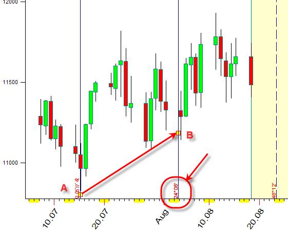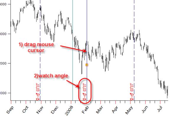 Here you may either watch for specific increment value (like 17 degrees) or you may touch some specific point on the chart (like the next top or bottom) and see the corresponding increment degree. When you release the mouse, you will see vertical lines representing the points you are looking for.