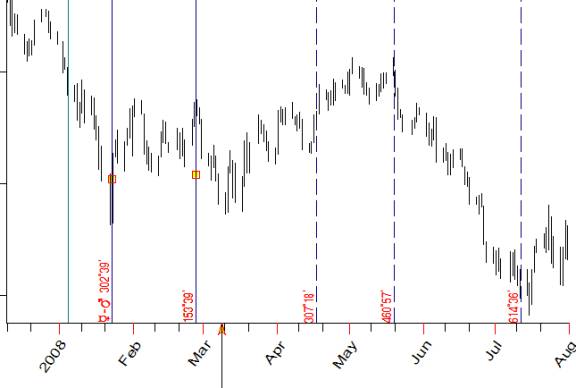 As an example see another variant of these lines. The starting point is January 22, 2008 when Mercury-Mars angle is 302.39 degrees, and the increment is 153.39 degrees: