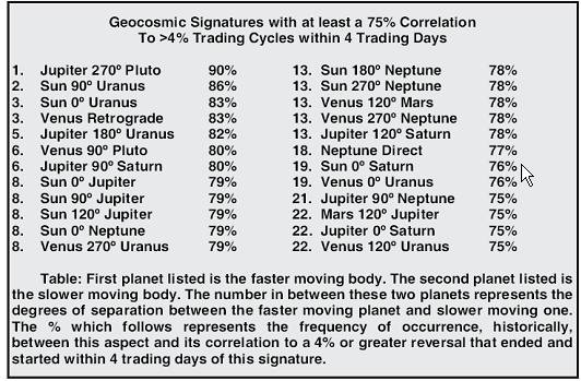 We analyzed all these aspects during this 119-years period, and this aspect took place more than 100 times. 22 times this aspect (with orb=6 degrees) has coincided with reversal points. The control group show us that if this aspect would not have any impact on the stock market, it should coincide with the turning points only 13 times. In other words, when this aspect took place the stock market reversed his trend more often (22 times) than the control group shows (13 times). Remember that this aspect took place more than 100 times, and in 22 cases some turning point occurred. In other words, turning points took place in 22% of these aspects, while control groups shows 13% only. If this aspect would not work, it would coincide with the turning points only in 13% of cases.