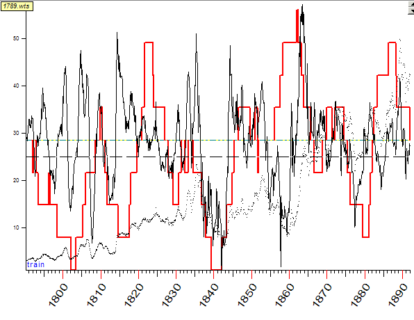 Here I used the reconstructed monthly price history for Dow from 1789 year provided by Bill Meridian.