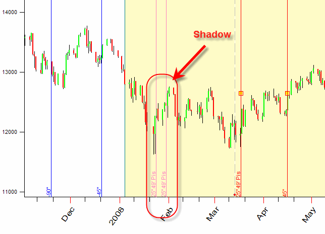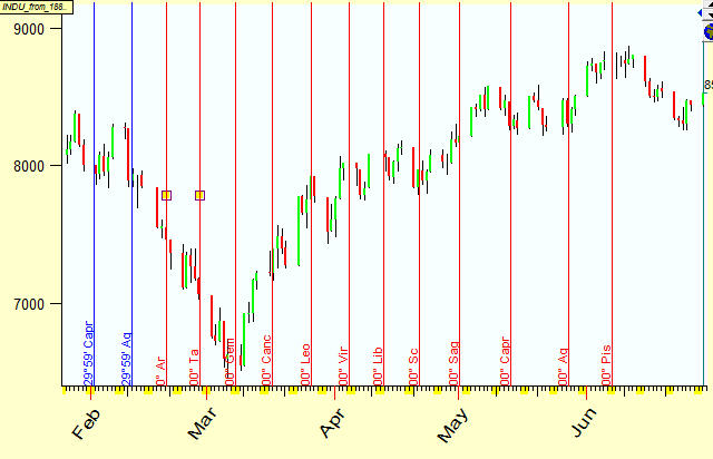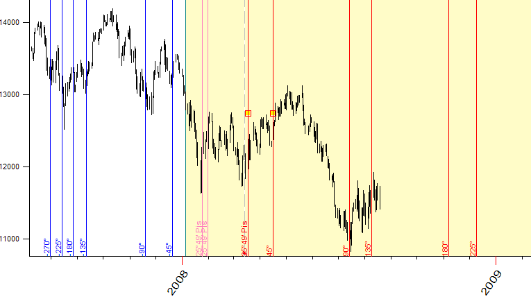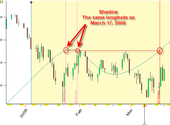 The program will display the longitude of our planetary picture together with the price chart. As you see, in the end of January 2008 the longitude has been the same as for our anchor data, March, 17 2008. It was caused by retrograde motion of one of the planets involved (Mercury in our case).