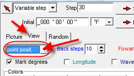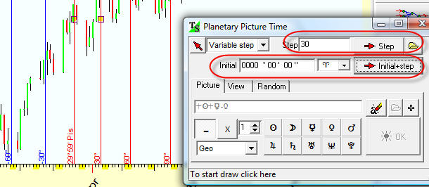 You will see the bunch of vertical stripes. The first (point A) vertical stripe is our initial point; here the program indicates that the coordinate of Sun+Mercury-Venus point is 25degrees 49 minutes of Pisces. The second stripe (point B) shows the angle separation between A and B points, I set it to 45 degrees. It means that the longitude of our synthetic planet is increased on 45 degrees. Next vertical stripe corresponds to 90 degrees increment (2x45); the next is 135 degrees (3x45).