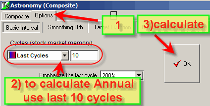 Usually the program uses all available price history to calculate the Annual cycle. For example, you have downloaded 20 years of price history. All this price history (before LBC) will be used to calculate this Annual cycle. However, you may have some insight that the Annual cycle for the last 10 years works differently than it has worked 20 years ago; thus you need only last 10 years of price history to calculate this cycle. In this case apply multiframe technology; in "Options" set stock memory=10: