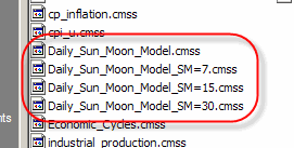 The first model, Daily_Sun_Moon_Model.cmss, uses all available price history to calculate the projection line.