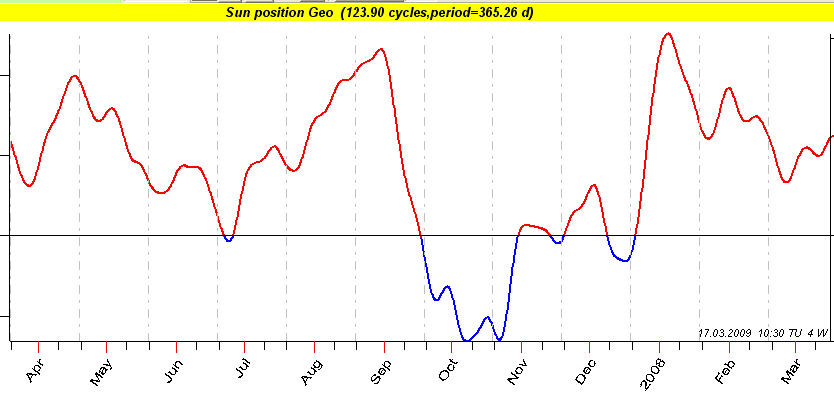 If we speak about intraday data, we deal with much faster cycles. The most important among them is Daily (Diurnal) cycle. Astronomically this cycle corresponds to the Sun's position regarding the horizon; astrologically it means the position of the transit Sun in transit houses; technically it corresponds to the Sun's position in In Mundo Zodiac. Thus 24-hour daily cycle is similar to one year Annual cycle; we simply use different Zodiacs there: for Daily Cycle it is In Mundo Zodiac while for Annual Cycle it is Tropical Zodiac. There is another fast cycle I recommend to pay attention to: this is the Moon's position regarding the horizon (= the Moon in houses = the Moon in In Mundo Zodiac). Due to the fast Moon movement, the period of this cycle is about 25 hours. The Sun and the Moon daily cycles form a tidal force that affects the Earth's inhabitants.