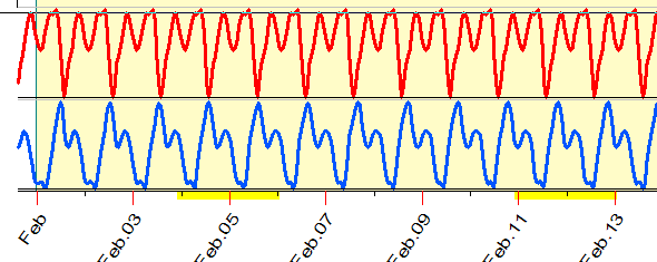 Red is the Sun daily cycle, blue - the Moon daily cycle.