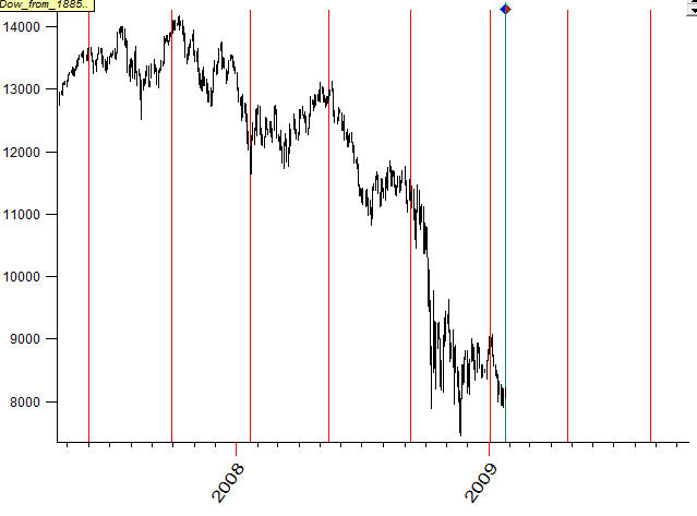 This is the price chart for Dow Jones Industrial Index together with moments when Mercury reaches maximum Eastern elongation: