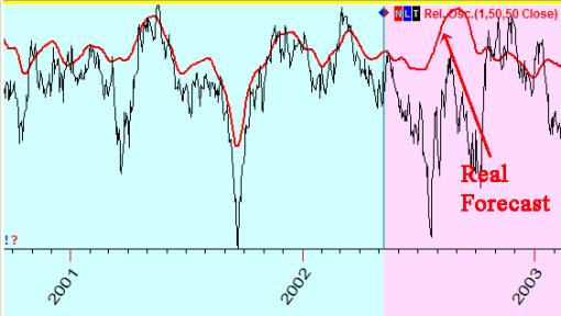 This is one of the models to forecast Dow Jones Industrial (DJI) index. This model is based on fixed cycles plus Neural Net. The Black line is the oscillator for DJI, the red line is the forecasting curve calculated by the Neural Net. It shows good fitness on the blue (training) interval. This is not surprising, because the program uses these points to train our Neural Net.