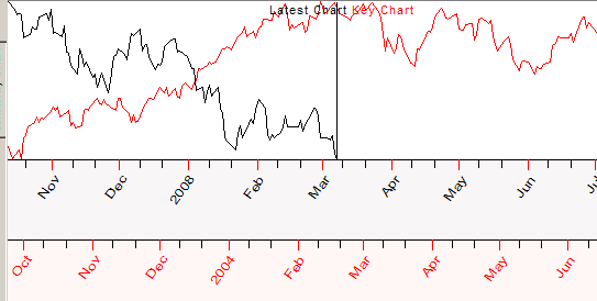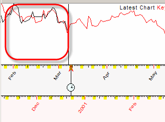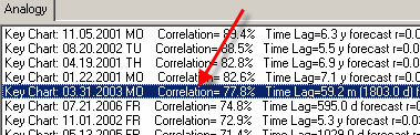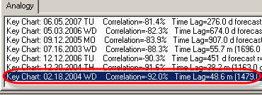 Also, you will see the list of Key Charts. Look at it. Each record has the ending date of the similar pattern of the price chart, the correlation between the two and the time lag parameter (i.e. how many days ago the similar pattern took place). You can highlight any Key Chart in the list to see it together with the analyzed chart. On the example below, the Key Chart ends on March 31, 2003 which has occurred 1803 days ago ("Time Lag" parameter):