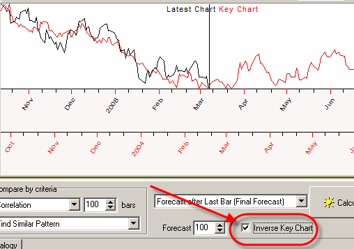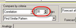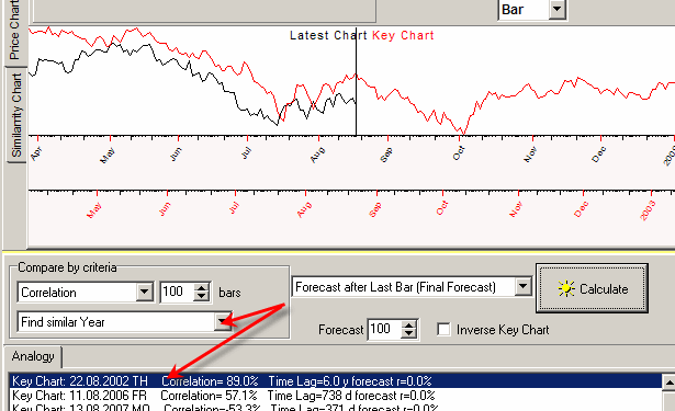 In this example the LBC is set to the end of December 2007. Thus the program is looking for similar patterns among the pieces of the price chart from August 2007 till the end of December 2007.