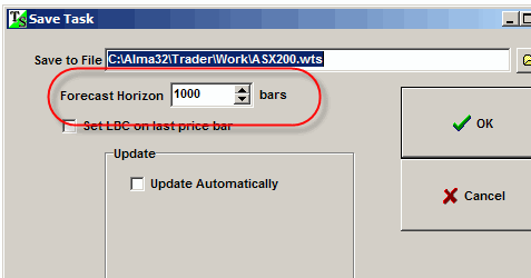 What is that? This is simply the amount of bars after the last available price bar used for calculating the forecast. The program does not use anything inside this Forecast Horizon: