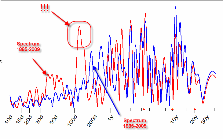 The important fact for us to remember is that this cycle has appeared the last two and half years. If we would calculate the same spectrogram four years ago, i.e. for the same data since 1885 till 2005 only, we would not find this cycle. See below the comparison of these two spectrograms (the red one is calculated for the period 1885-2009 while the blue one is for 1885-2005):