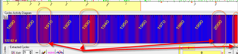 Practically it means that within the last 122 x 7 days (i.e. two and half years) this cycle is strong (here we used multiframe spectrum with stock memory=7, see here more about it: http://www.timingsolution.com/TS/Mini/47/index.htm).